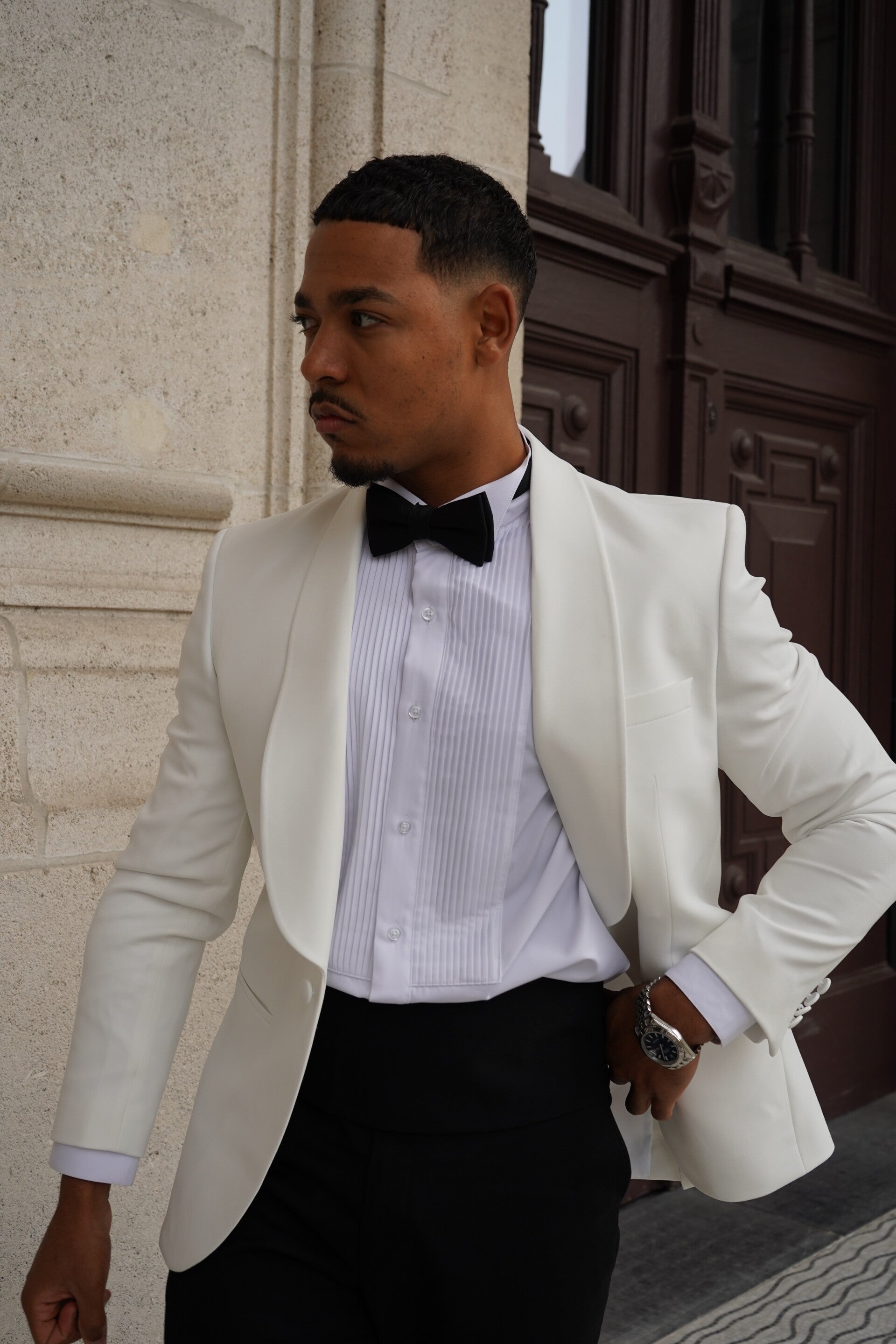 Onze witte smoking is tot in detail afgewerkt voor een moderne, luxueuze uitstraling