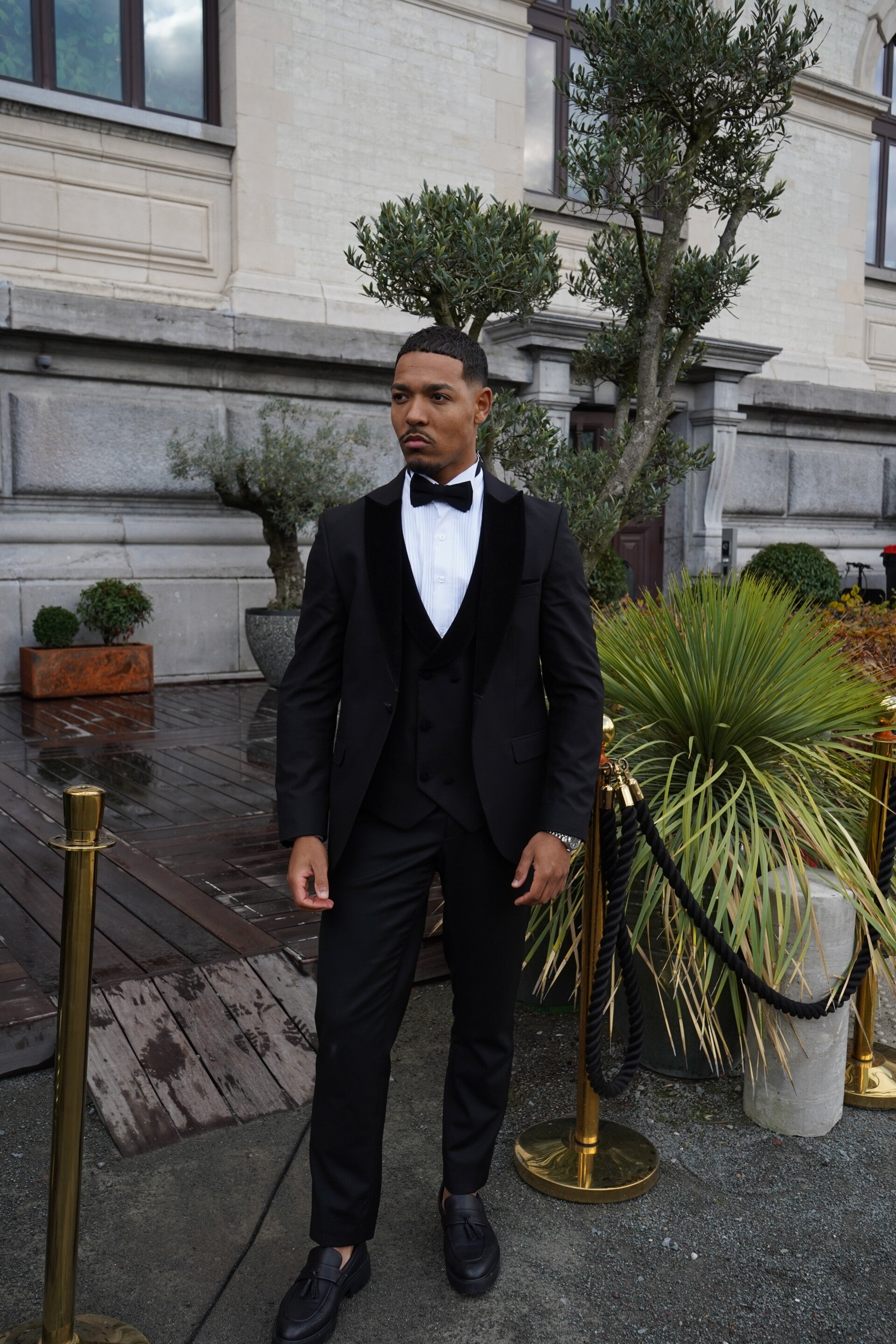 Deze zwarte smoking is verfijnd afgewerkt met fluwelen revers, wat zorgt voor een rijke textuur en een subtiele diepte in de look.