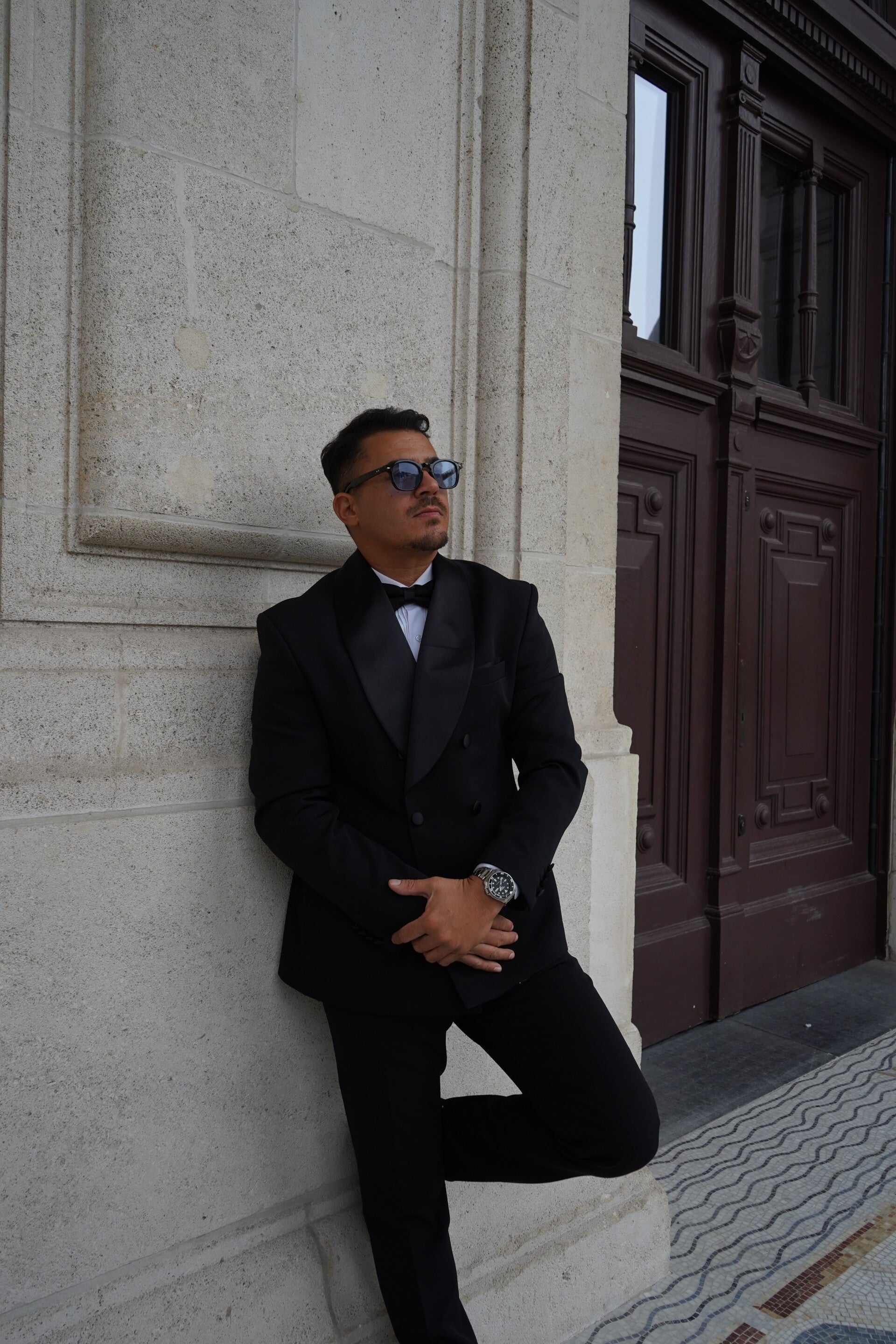 Deze verfijnde zwarte smoking met satijnen afwerking en dubbele knopen op de borst straalt tijdloze elegantie uit.